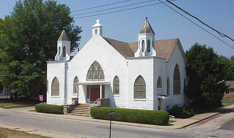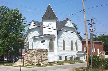 The church was built in 1902 on land platted in 1887. The church was raised and a basement was dug in 1911, providing space for a new coal furnace, kitchen, pastor's study and Sunday School room. In January of 1938, the church was heavily damaged by fire, but was faithfully restored. The north addition, consisting of a single story of brick construction, was built in 1947 and later expanded with a second story in 1954. The front steps, located on the southeast corner, were rebuilt to their current configuration in 1954. The two story, Gothic revival style church as a limestone foundation and aluminum siding. The south and east facades feature tall, paired, arched stained glass windows and steep gable roofs that intersect on a steep pyramidal roof. Within the intersection is a 2-1/2 story, square steeple with arched, multi-light windows and a steeply pitched pyramidal roof. A second entrance is located on the east side. The house at 434 Benton once served as the minister's residence. Today, the church is the Siloam Spring Baptist Chapel.